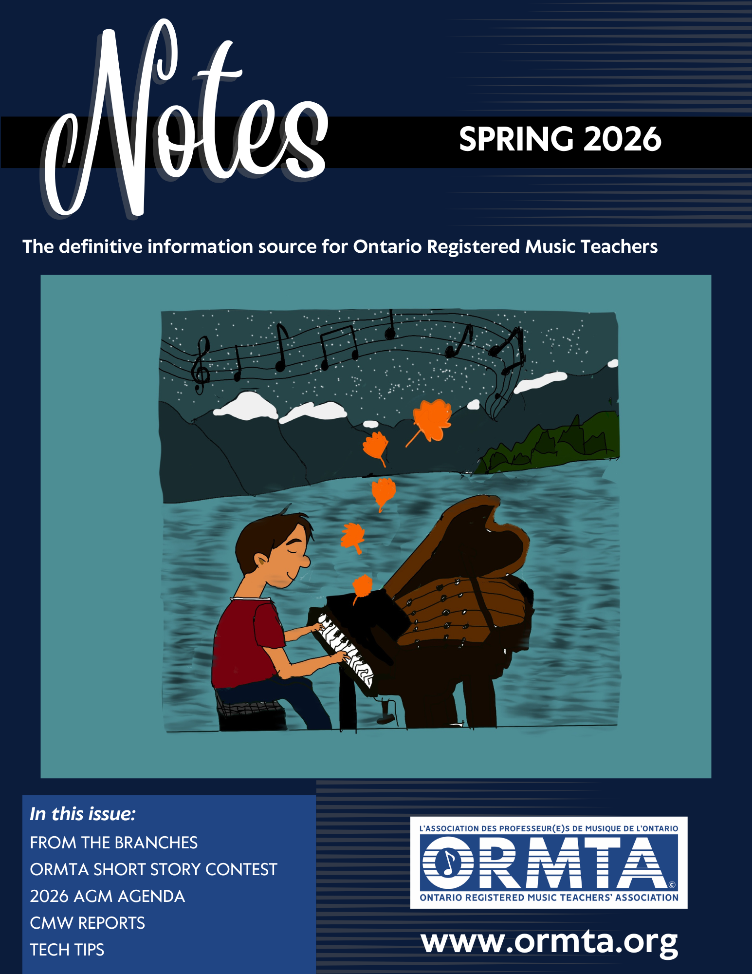 Notes Magazine is the definitive information resource of the Ontario Registered Music Teachers' Association. With three issues annually (Spring, Summer, and Fall), Notes offers interesting articles on pedagogical concepts and research, news on ORMTA activities and initiatives, and reviews of teaching materials - important information for the ORMTA member and wider music teaching community!